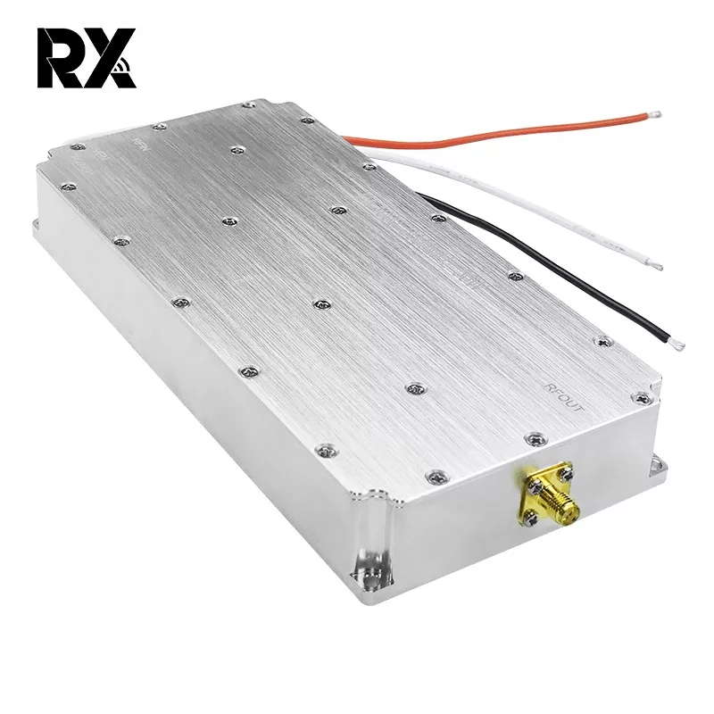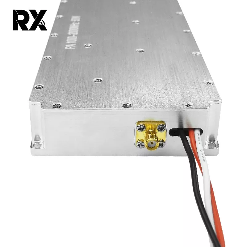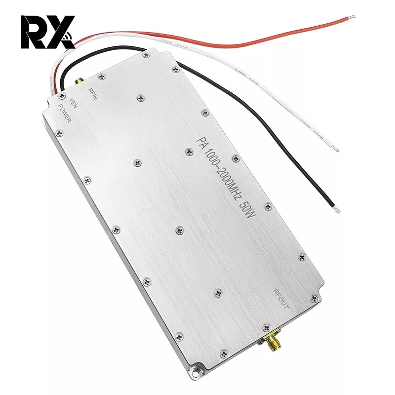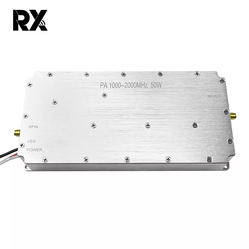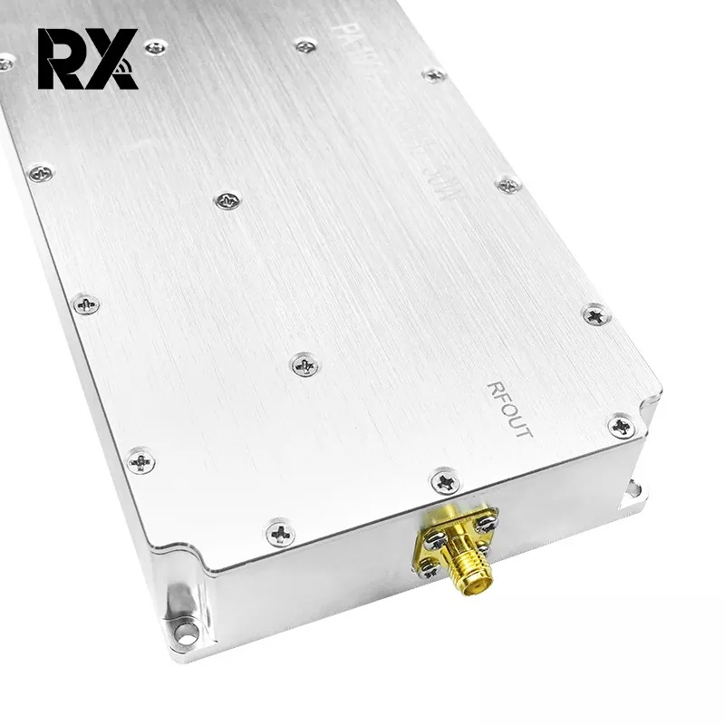 This is a 50W 1000-2000MHz No-signal-sourcue Power Amplifier. It was independently developed by Shenzhen Rongxin Company. Its function is to amplify small RF signals (0-10 dBm) to approximately 47 dBm (50 W), providing high-power excitation for the back-end antenna. This is useful for long-distance wireless transmission or electronic warfare scenarios, and is particularly effective in jamming drone signals.